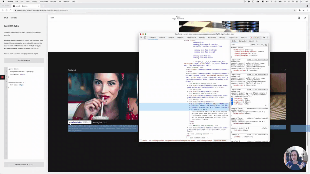 Moving onto a different part of the site, we’ll try to change the font size of the summary block excerpt, and run into a pretty strange issue. This one will get a bit tricky to troubleshoot since we’ll have to deal with two problems at the same time.
